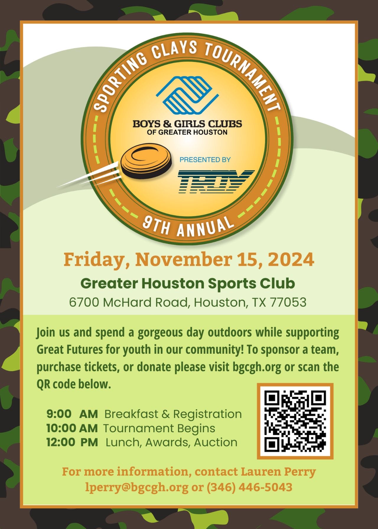 The 9th Annual Boys & Girls Clubs of Greater Houston Sporting Clays Tournament presented by Troy Construction is just around the corner—happening on Friday, November 15th