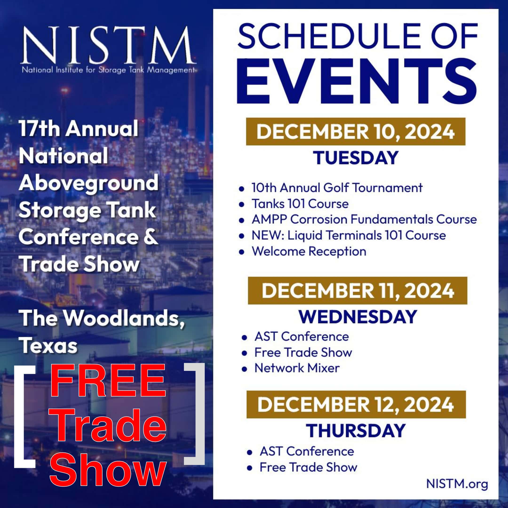 FREE Passes For NISTM (Expo Hall) 17th Annual National Aboveground Storage Tank Conference & Trade Show from December 10-12, 2024 – Houston