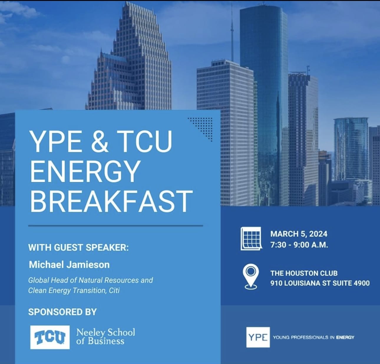 Join YPE Houston for breakfast and networking featuring Michael Jamieson, Global Head of Natural Resources and Clean Energy Transition, Citi. The topic will focus on financing the future of energy and is graciously sponsored by TCU Neeley School of Business.