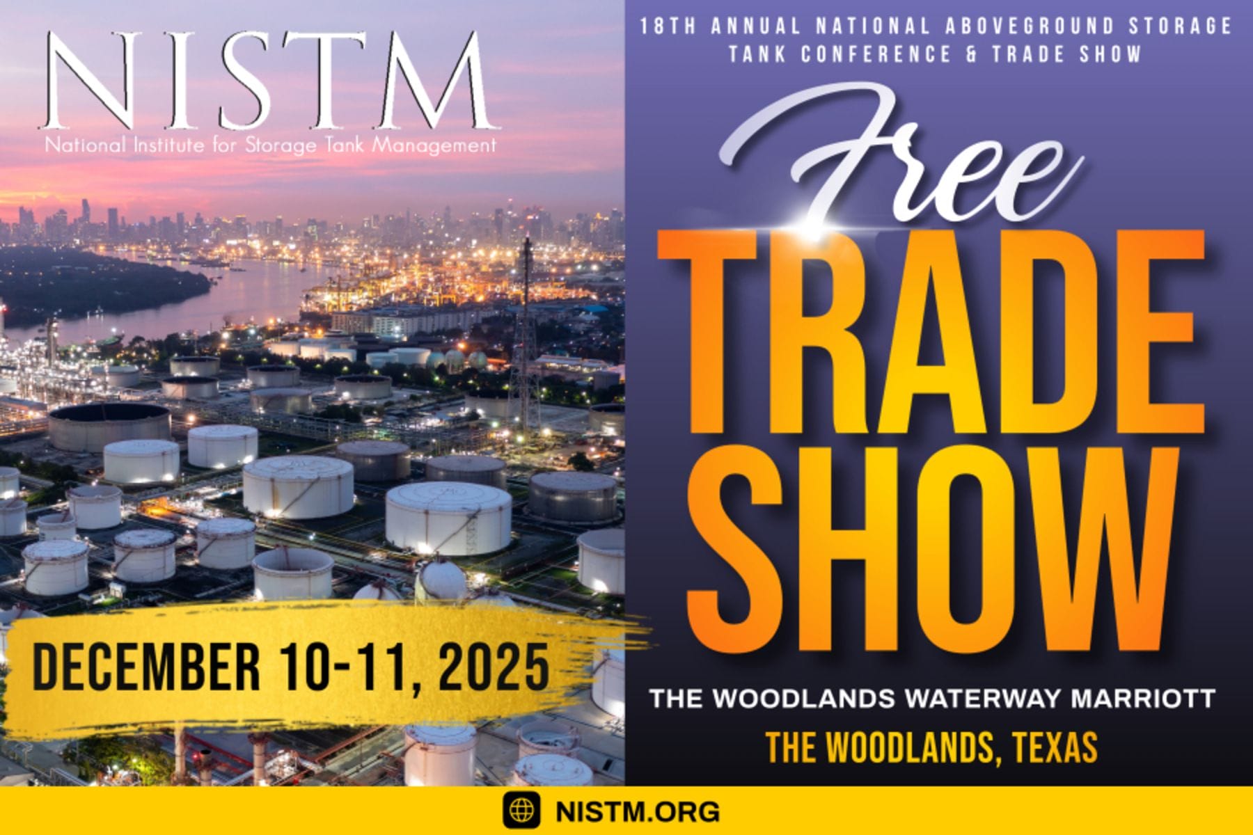 FREE PASSES for the 18th Annual National Aboveground Storage Tank Conference & Trade Show Co-Located Courses- Dec 9-11, 2025 – The Woodlands, Texas
