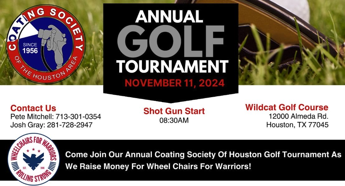Grab your favorite golfers and come join the Coating Society of the Houston Area for our annual golfing event at the WILDCAT Golf Club on November 11, 2024. Proceeds from this tournament go toward industry scholarships and the Wheel Chairs For Warriors Charity.