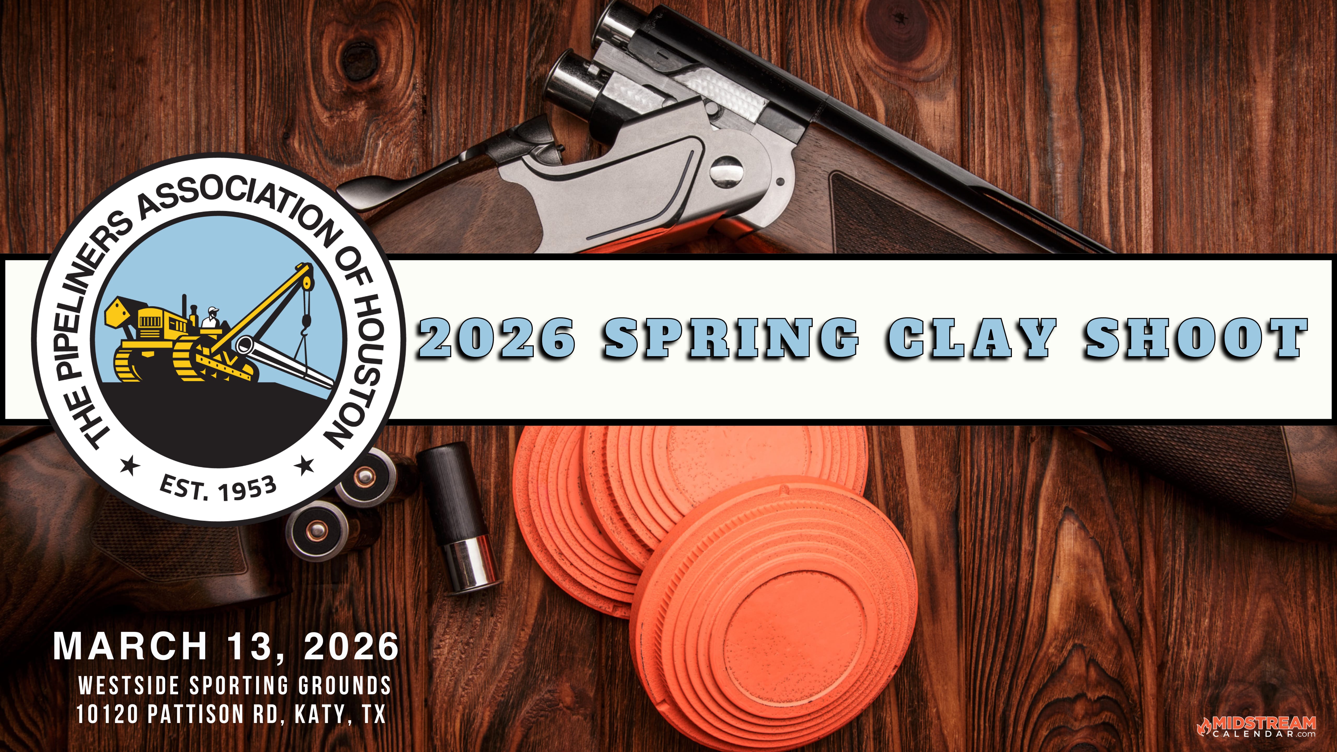 The Pipeliners Association of Houston Educational Fund is very pleased to once again sponsor our Spring Clay Shoot for members and guests Friday March 13, 2026 at Westside Sporting Grounds.